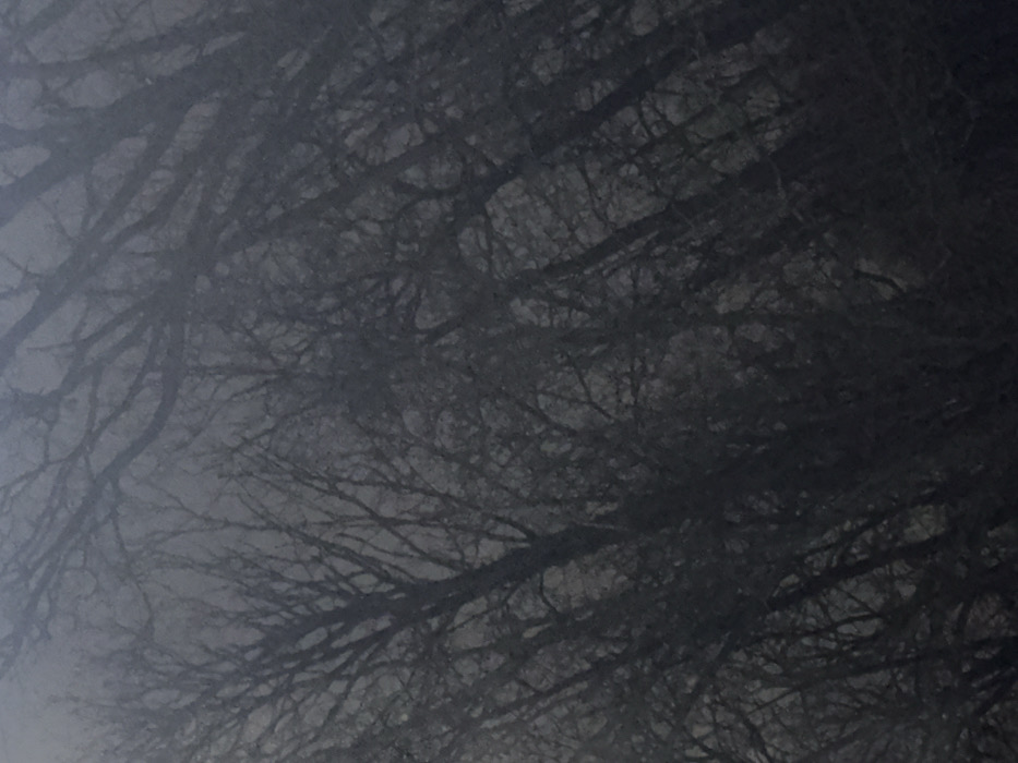 Silhouetted branches of trees densely intertwine, creating a web-like canopy against a dusky or foggy sky. The overall tone is monochromatic, with shades of gray and black dominating the scene. Light is limited, suggesting a nighttime or overcast environment. The image is taken from a low angle, looking up into the dense network of bare tree limbs.