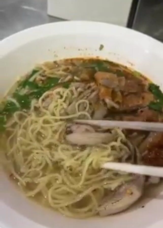 bowl of noodle soup on a stainless steel surface. The soup includes noodles, pieces of meat, and green herbs. A pair of white chopsticks lifts a portion of noodles from the bowl. A white tissue box and a metal container are visible in the background.
