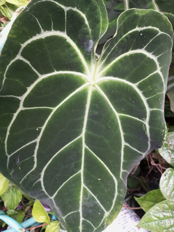 A close-up vertical photographic image displays a single, large, dark green plant leaf, characteristic of an Anthurium species, located in Salai Har Htan, Myanmar. The leaf features prominent, thick, white to pale green venation that forms a distinct, highly reticulated pattern across its entire surface, contrasting sharply with the deep green, slightly textured lamina. The central midrib is clearly visible, from which numerous secondary veins branch outward, further subdividing into tertiary veins. Small, light-colored specks and minor dust are observable on the leaf's surface. The leaf exhibits a broad, cordate shape. The immediate background shows blurred, lighter green foliage in the lower left and darker green plant elements with reddish stems in the lower right, indicative of a densely planted environment. A faint light blue object is partially visible in the bottom left corner. No individuals, specific actions, or interactions are depicted.
