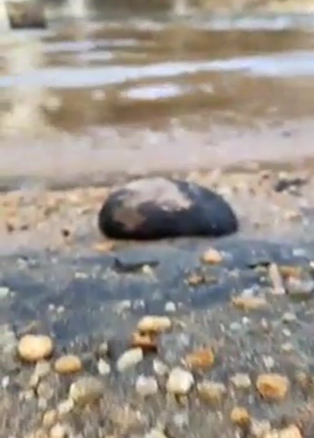 The video pans up from a close-up of gravel and a dark rock to reveal a waterfall in the distance