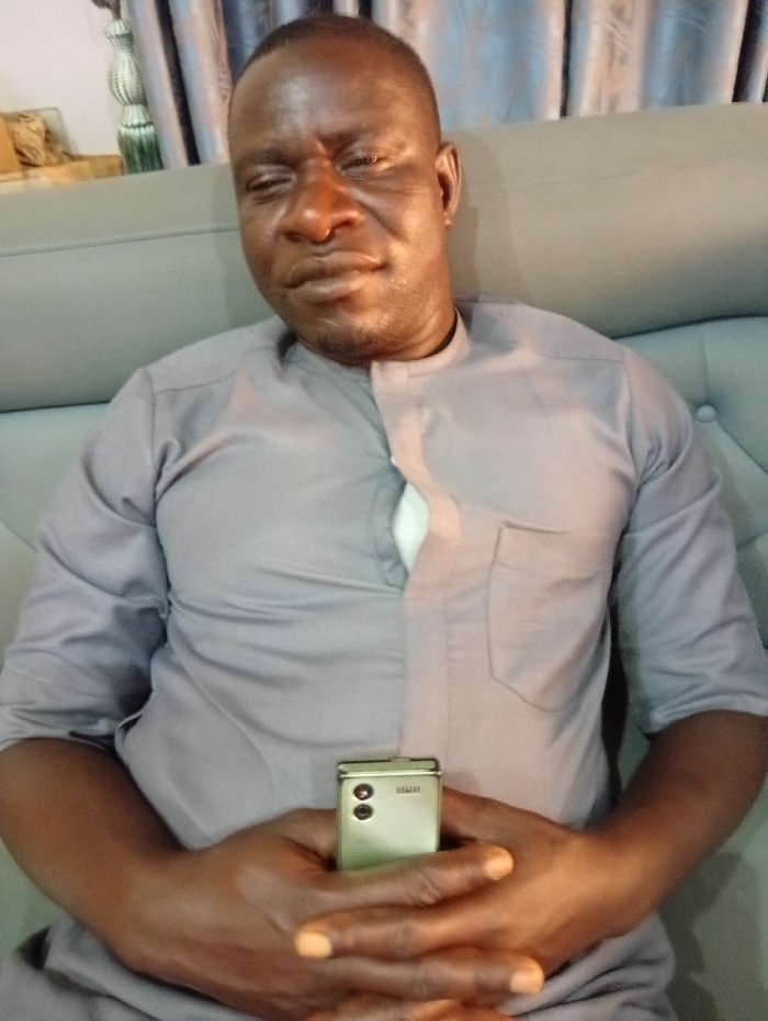 A single adult male is depicted seated indoors in what appears to be a residential or lounge setting within the city of Jimeta, Nigeria