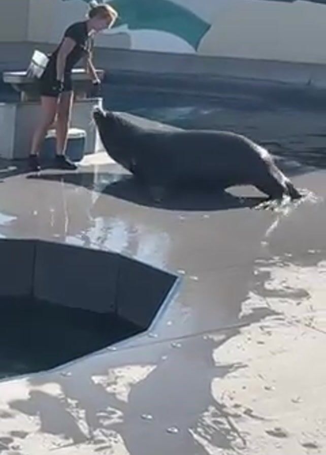 A woman in a black shirt and black shorts stands on a white platform and holds something in her hand. A sea lion, facing the woman, is sitting on the platform in front of her and slightly raises its head. The platform is next to a pool of water. A painted mural is in the background.