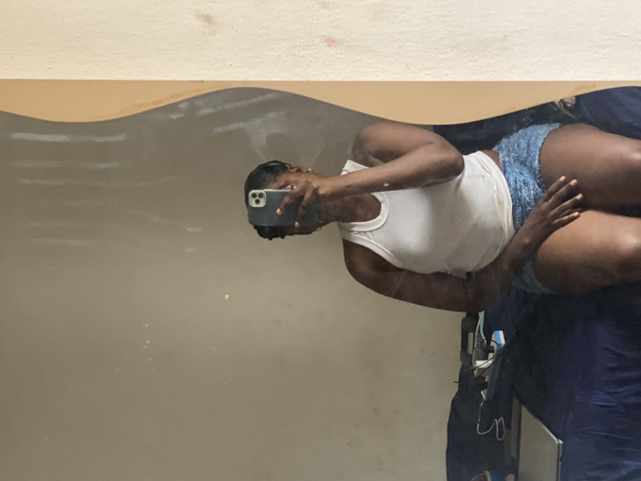 An indoor mirror selfie depicts an individual, presumably female, with dark skin, seated and reflected in an irregularly shaped mirror in Sabon Tasha, Nigeria. The subject wears a white sleeveless top and blue textured shorts. A dark-colored smartphone, held by the subject, obscures their face as it captures the image. The subject's right arm is visible, with the hand resting on the upper left thigh. To the subject's left, a dark blue bed covering is visible, upon which an open silver laptop rests, alongside other indistinct dark objects. The walls are light-colored; the wall reflected in the mirror shows various smudges, while the wall directly adjacent to the mirror on the right exhibits reddish-pinkish marks and discoloration. The mirror itself also shows signs of smudging.