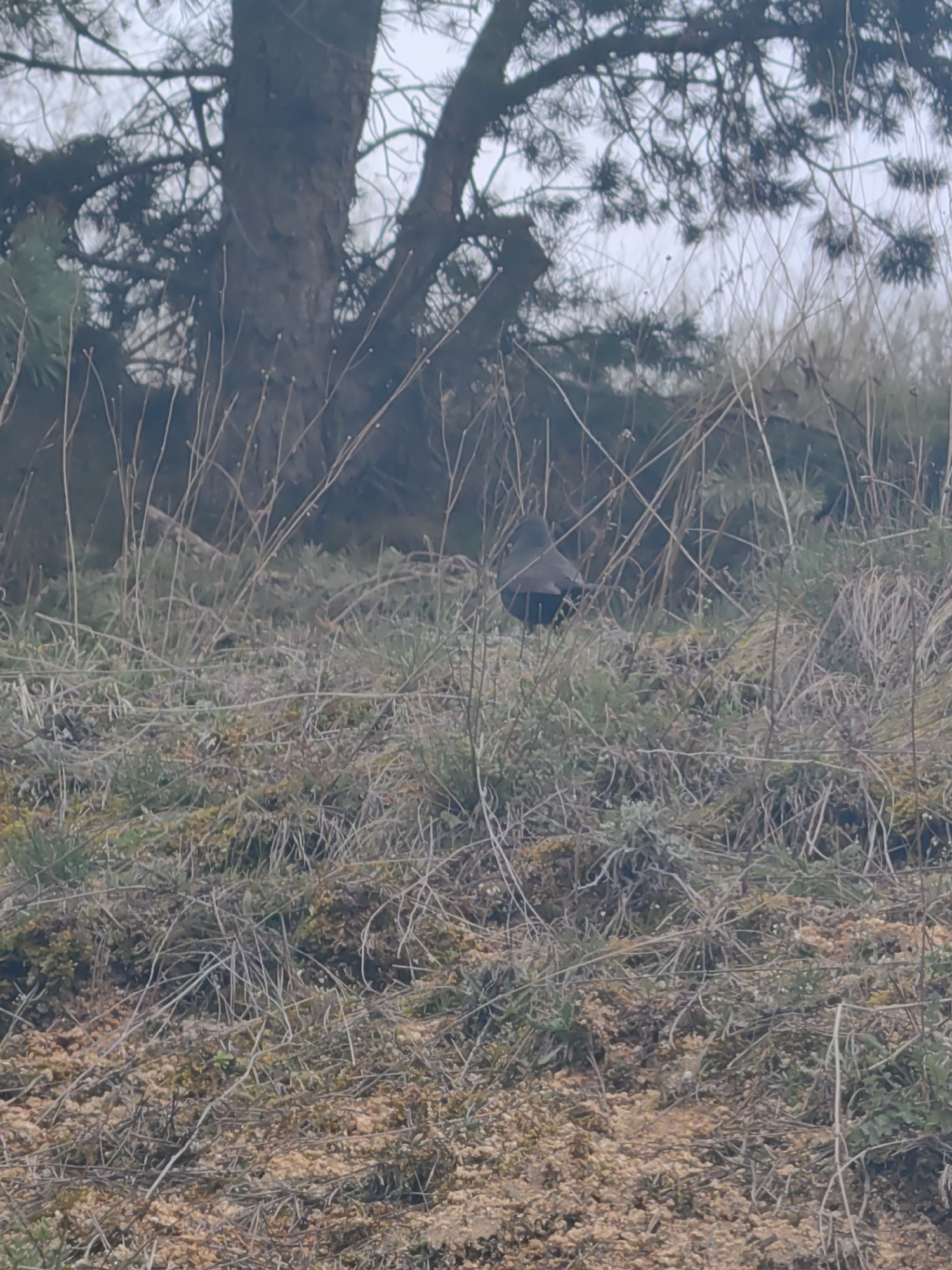 ground-level view in a grassy area with a tree in the background. There appears to be a dark-colored bird in the middle ground, partially obscured by the vegetation. The environment is somewhat overgrown with a mix of dry grasses, moss, and other ground cover. The sky is overcast. The location is presumed to be in Slatina, Bulgaria, as requested.