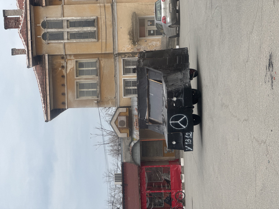 The image displays an outdoor scene in Vinogradets, Bulgaria, under an overcast sky. In the foreground-center is a homemade, rudimentary four-wheeled vehicle constructed from black, possibly tarp or cardboard-like material. It features a rectangular windshield, and its front bears a hand-painted white peace sign and the white alphanumeric characters "У 13 12". The vehicle is stationary on a cracked, light grey paved surface. In the mid-ground, to the left of the vehicle, is a single-story building with a red tiled roof and a red plastic-tarp enclosure where two indistinct individuals are partially visible seated. A red bicycle is parked near this structure. An air conditioning unit is mounted on the wall of a smaller, intermediate building. To the right and dominating the background is a weathered, two-story ochre-yellow building with a reddish-brown tiled roof, exhibiting signs of age and disrepair. It features various window styles, including two standard rectangular windows and a tall, multi-paned arched window on the upper floor. Two brick chimneys are visible on the roof. A silver Volkswagen Golf (likely a Mk5 or Mk6) with a Bulgarian license plate (partially visible as "PB B2327 HA") is parked in front of the lower level of this building, facing away from the viewer. Bare tree branches are visible against the sky in the upper left quadrant. The overall scene depicts an urban environment with an unusual homemade vehicle situated amongst older architecture and modern parked cars. No direct actions or interactions are discernible between subjects.