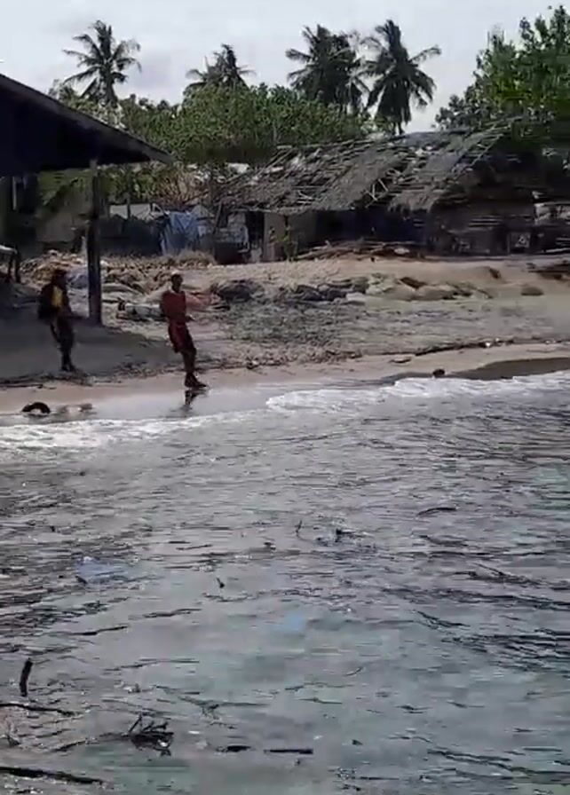 beach scene with two people wading in the shallow water near the shore. The water is filled with floating debris. Behind them, on the sandy beach, there's a wooden structure with a roof, and further back, a dilapidated hut-like building with a damaged roof. Palm trees dot the landscape, adding to the tropical feel. The sky is overcast, suggesting a potentially cloudy day.