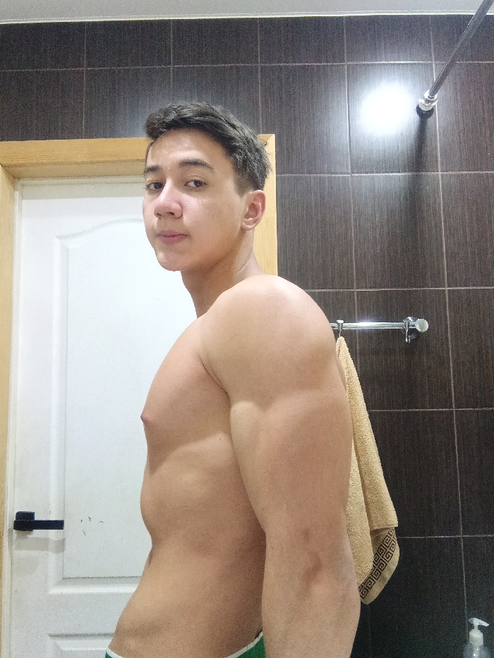 A shirtless young man stands in a bathroom, facing slightly to the side. He has short dark hair and appears muscular, particularly in the arms and shoulders. Behind him is a white door with a black handle and dark brown tiled walls. A towel hangs on a silver rack attached to the wall. A light fixture is visible on the wall above, along with a bottle on the counter.