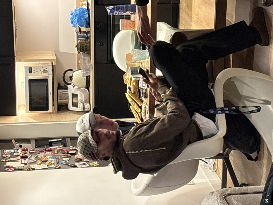 The image depicts an indoor scene within what appears to be a residential kitchen and dining area. The specific location within Saint-Denis, France, is not discernible from the visual information provided. In the foreground, a male subject, appearing to be in his 20s or 30s, is seated on a white, modern-design chair with a curved base. He has a beard and mustache and is wearing a dark brown hooded sweatshirt with light-colored accent stitching, a white t-shirt underneath, black pants, and brown slip-on shoes. A patterned baseball cap (beige with dark brown, red, and green stripes) is on his head, and a blue and white lanyard hangs around his neck. He is holding a black smartphone in his left hand and is looking towards the camera. His legs are crossed. Behind and slightly to the right of the main subject, a second male is partially visible. He has fair skin and is wearing a white baseball cap with a dark cloud-like emblem and a dark top. He appears to be looking towards the table or the main subject. On the far right, a third individual's right hand and forearm are visible, reaching towards the table from off-frame. The central middle ground is occupied by a wooden table. On the table, several flatbreads or savory pastries are arranged, along with multiple drinking glasses (including clear, textured blue, and pink patterned types), a dark patterned ceramic mug, a small jar (possibly containing spread), a blue plastic bag, and a blue and white packaged item. The background reveals a kitchen area. A white refrigerator door, heavily adorned with magnets and photographs, is visible on the left. The kitchen features dark lower cabinets, a dark countertop, and a combination of light wood-colored open shelving and dark upper cabinets. Appliances present include a white microwave oven on a shelf, displaying "12:1" on its digital clock, a silver food processor or blender below it, and a cream-colored electric kettle. Various pots, pans, and bowls are arranged on the countertop. An oven is visible below the counter. The floor is a light-colored wood or laminate, and under-cabinet lighting illuminates the kitchen counter.