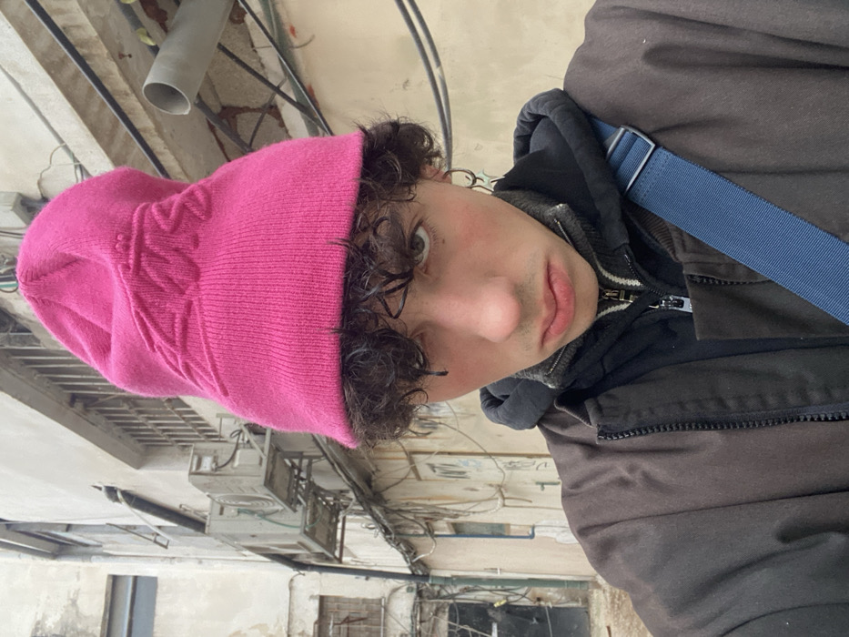 A young person wears a bright pink beanie, dark jacket, and blue shoulder strap. Curly dark hair frames the face. The background features building exteriors with windows and wires, suggesting an urban environment. The image's perspective is from a low angle, looking upwards towards the individual.