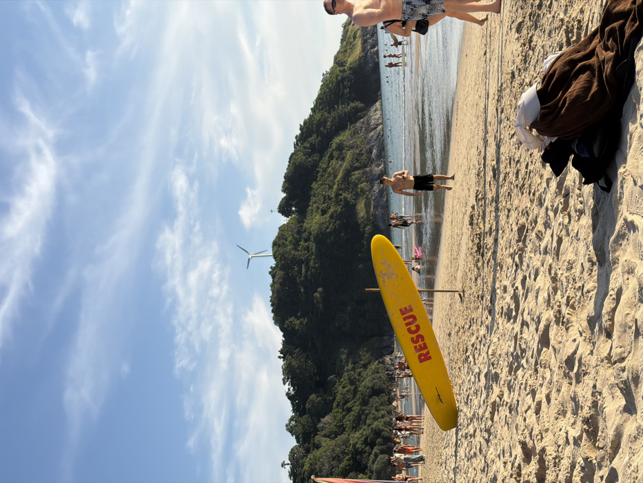 The image displays Nai Harn Beach in Rawai, Phuket, Thailand, under a clear blue sky with scattered white clouds. The foreground consists of golden sand, with a brown towel and a white cap visible on the sand at the bottom right. In the mid-ground, a yellow rescue surfboard, marked with the word "RESCUE" in red capital letters, is propped vertically on a wooden stand. The surfboard exhibits signs of wear. Numerous individuals are present on the beach and in the water. On the left, a group of approximately ten to fifteen people stands near the water's edge. A shirtless male in dark shorts is observed walking out of the shallow ocean water in the central mid-ground. On the far right, a partially visible shirtless male wearing patterned swim trunks and sunglasses walks towards the right side of the frame. Additional individuals are scattered throughout the blue-green ocean water, with one person visible on a pink inflatable. The background features a densely forested hill. A white, three-bladed wind turbine is prominently situated on the hilltop, slightly right of the frame's center. A small cross-shaped structure is also visible on the hill near the wind turbine. The ocean extends into a bay, with rocky outcrops visible along the distant shore.