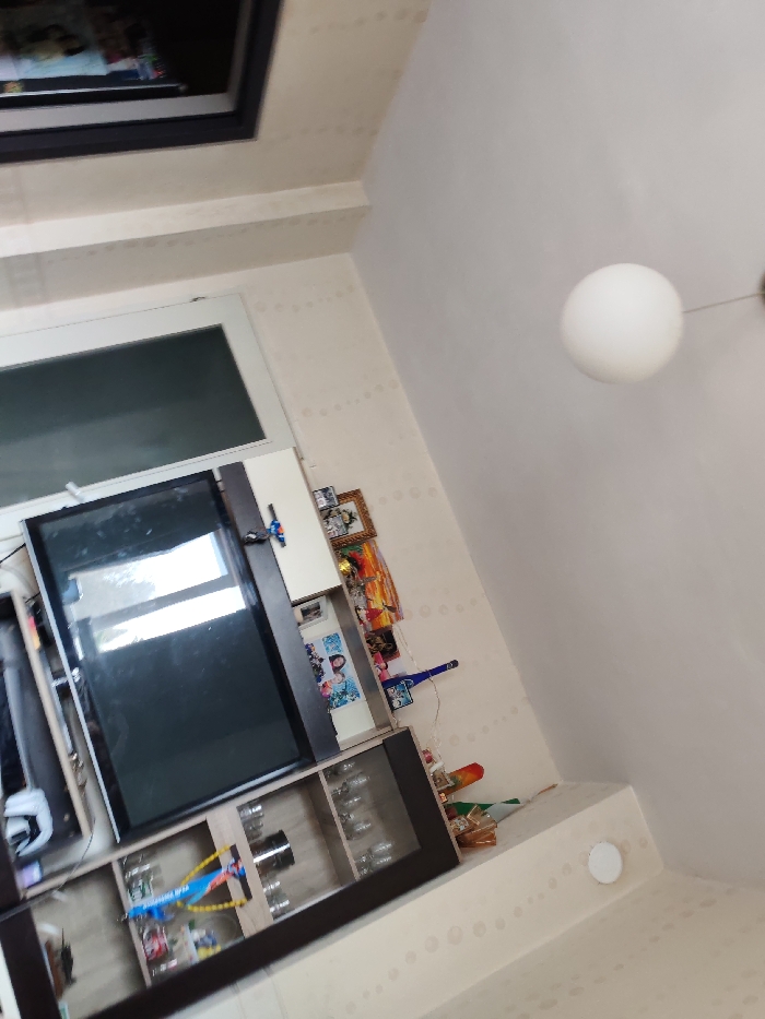 The image displays an indoor residential or commercial space, captured from a low angle looking upwards and across the room. On the left, a large, dark-screened television with a dark frame is mounted, reflecting natural light and partial outlines of trees from an exterior view. Above and slightly to the left of the television, a white-framed window with a dark pane is visible, also reflecting outdoor illumination. Adjacent to the television on the right, a multi-tiered cabinet or shelving unit is present. This unit features dark frames, light-colored panels, and glass-fronted compartments. Within these compartments, numerous clear drinking glasses are meticulously arranged in rows, alongside a cylindrical metal object and a blue and yellow object resembling a toy slingshot. The top and sides of this unit are adorned with various items, including framed photographs, colorful prints, and a dark blue bottle. The walls are covered with light-toned wallpaper featuring a subtle, repeating pattern of light circular or oval indentations. The ceiling is plain white. A spherical white light fixture is suspended from the ceiling by a thin wire in the upper-right section of the image. A small, white, circular device, potentially a smoke detector or sensor, is affixed to the wall near the ceiling line in the lower-right quadrant. No individuals are present in the scene. The specific location within Burgas, Bulgaria, is not discernible from the image content.