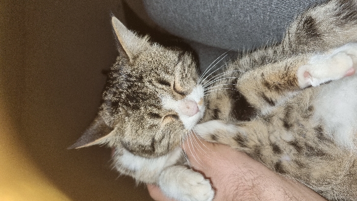 A domestic cat is depicted in a close-up, indoors, in Yangi-Khayat, Uzbekistan. The cat, exhibiting a tabby pattern of brown, grey, and black stripes and spots, with white fur on its face, chest, and paws, is lying in a relaxed posture, likely sleeping or resting, with its eyes closed. Its pink nose and prominent white whiskers are visible. A human's bare arm and hand, showing light skin tone and arm hair, are positioned on the left, gently supporting or caressing the cat's side. Part of a human leg, clad in grey fabric, is visible on the right, providing a surface for the cat. The background is a plain, dark brown surface, illuminated by a warm light source from the upper left.