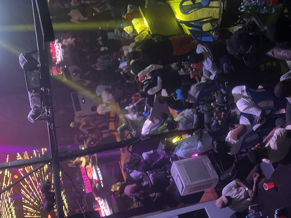 A crowded indoor scene shows many people sitting on various surfaces, perhaps the floor. Some individuals are wearing white shirts. Drinks in red cups are scattered throughout. An air conditioning unit sits among the crowd. Stage lighting illuminates sections, with reflections on a shiny surface adding complexity. Part of a stage and a lighting rig are visible. The overall impression is of a casual gathering in a club or event space.