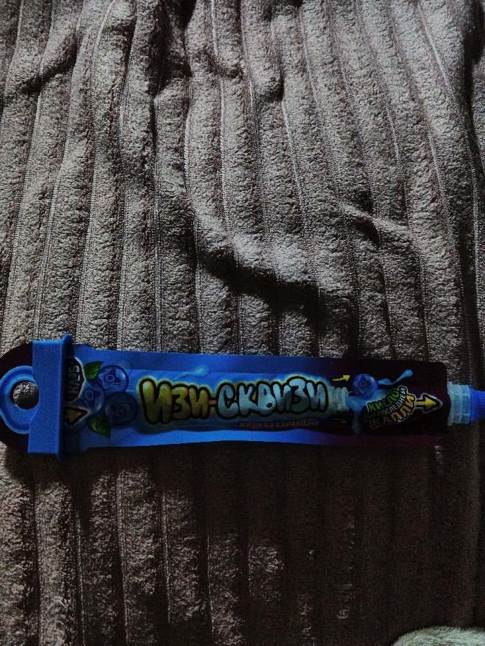 A single blue, tubular candy package is horizontally centered on a textured, ribbed fabric surface of a brown-beige color. The packaging features the Cyrillic text "ИЗИ-СКВИЗИ" (Izi-Skvizi) and "ЖИДКАЯ КАРАМЕЛЬ" (Liquid Caramel), with additional text "КИСЛО ДО ПОСЛЕДНЕЙ КАПЛИ" (Sour to the last drop). Blueberry illustrations are visible on the label. A light blue plastic ring-shaped component is attached to the left end of the package, and a white dispenser cap is visible on the right end. The fabric surface shows vertical ribbing and subtle variations in texture. Lighting appears to originate from the upper left, casting a shadow below and to the right of the candy package. The scene is devoid of people or other significant objects. This item is situated within the city of Chaikovsky, Russia.