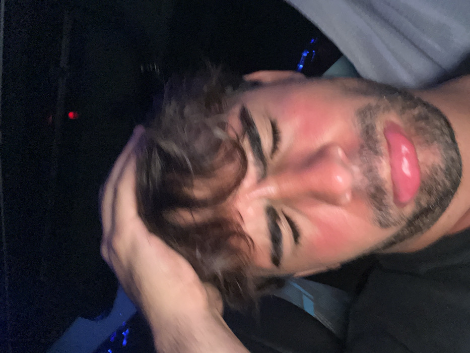 A man rests his head on his hand, his eyes closed. He has dark, wavy hair and a beard. His skin appears flushed or red. He seems to be in a dark environment with minimal lighting. A portion of his t-shirt is visible. The image is slightly tilted, giving a unique perspective of the subject.