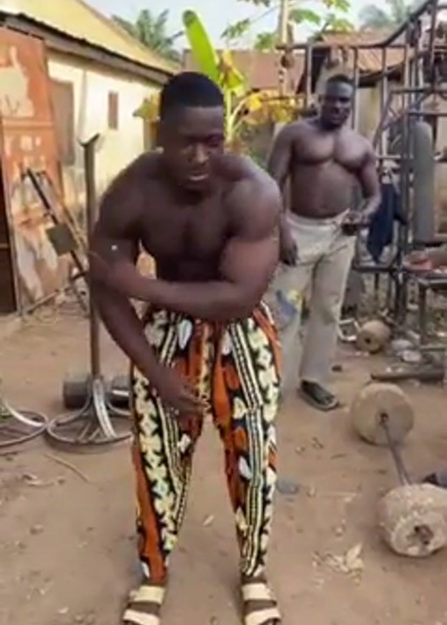 five men standing in a dusty outdoor area, likely a village or rural setting. Four of the men are shirtless and muscular, with one of them flexing and posing for the camera. The men are wearing colorful patterned pants or shorts and sandals. One man is wearing athletic shorts. A makeshift barbell with concrete weights is on the ground, along with other pieces of gym equipment. The buildings in the background appear to be simple, possibly made of corrugated metal or other basic materials. They are talking and seem to be enjoying themselves.