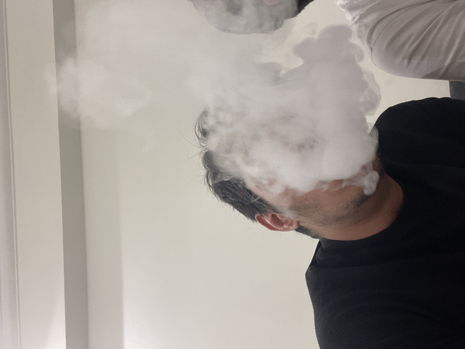 The image depicts an indoor scene. The specific location within Rukn ad-Din Municipality, Syria, cannot be determined from visual information. Two individuals are partially visible. The primary subject, positioned on the left, is a male with dark hair and facial stubble, wearing a black long-sleeved garment. He is actively exhaling a dense, white plume of vapor that originates from the area of his mouth and obscures a significant portion of his face, extending upwards and to the right. A second individual is partially visible on the far right of the frame, wearing a white shirt, with only their right shoulder, arm, and part of their head (obscured by vapor) discernible. The background consists of a plain, light-colored wall with a visible ceiling line or molding towards the top. There are no other discernible objects or specific interactions beyond the individuals' presence and the act of vapor exhalation.