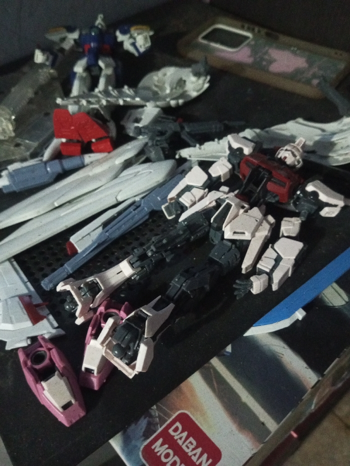 The scene, located in B. Nam Ngao, Laos, displays a collection of plastic model kit components, predominantly humanoid mecha, arranged on a dark, textured surface. A central, partially assembled mecha model, colored white, dark grey, and red, lies horizontally across the mid-ground, with its head attached but several limb and armor components detached. To its left, multiple white wing-like structures and elongated blue weapon parts are scattered. Detached pink leg armor pieces are visible in the lower left. In the upper left background, a smaller, fully assembled blue and white mecha model stands. Other loose, grey and white model parts are dispersed throughout the frame. The upper right background reveals a translucent phone case. A cardboard box segment, partially visible in the lower right, displays the text "DABAN MOD". The items suggest an ongoing or recently completed model building activity. No human subjects are present. The environment is dimly lit.