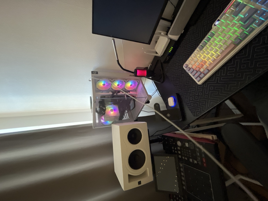 The image depicts an indoor room in Saint Petersburg, Russia, configured as a personal workspace or office. The primary focus is a desk setup featuring computing and audio equipment. On the left, a large, rectangular white audio monitor speaker with two circular dark speaker cones is positioned on an elevated stand. Below it, on a darker desk surface, rests a black electronic device, likely an audio interface or MIDI controller, with a dark rectangular screen and numerous control buttons and knobs. A white cable extends diagonally from this area towards the foreground. In the center, a transparent-sided desktop computer tower with multiple internal fans displaying multi-colored RGB lighting is situated on a shelf above the main desk. To its right, a black desk lamp with a flexible silver neck and a cylindrical base emitting a red glow is visible. On the desk surface below, a black wireless charging pad holds a white AirPods case. On the right side of the desk, a large, dark computer monitor with a visible stand is positioned. Its screen is off or dark. Beneath the monitor, a white modem or router with two antennas rests on a black base, next to a grey soundbar or speaker. In the foreground on the right, a mechanical keyboard with multi-colored RGB backlit keys is placed on a dark mousepad featuring a geometric pattern. The background consists of light-colored walls. A window partially covered by a light brown curtain is visible on the far left, providing ambient light. No individuals are present in the scene, which is static. The arrangement suggests the space is used for computing, gaming, or audio production.