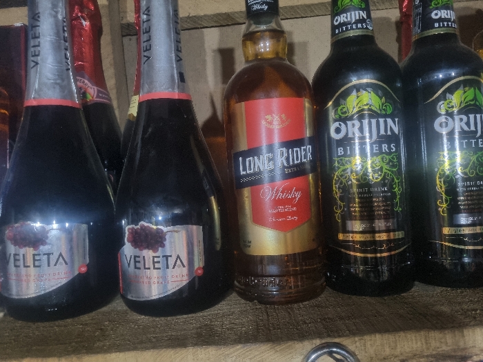 several bottles of alcoholic beverages. Two bottles labeled "VELETA" feature grape imagery and "RED GRAPE" text. A bottle of "LONG RIDER" whisky is visible, along with two bottles of "ORIJIN BITTERS," characterized by green leafy designs. The "ORIJIN" bottles also bear the words "SPIRIT DRINK." The bottles are arranged in a row, suggesting a shelf or display.