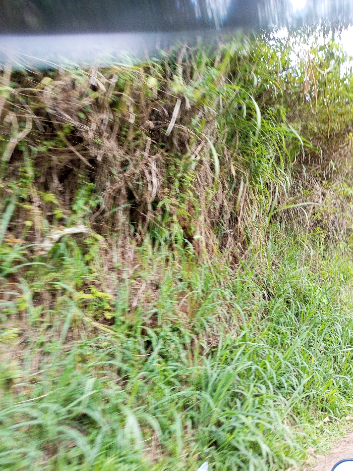 The image displays a vegetated roadside embankment in Matale, Sri Lanka. The embankment rises steeply, densely covered with a mix of light green, dark green, and dry brown grasses and shrubbery. The foreground, particularly the lower right section, features vibrant green, tall-bladed grasses. Further up the embankment and towards the left, the vegetation appears drier and more tangled. The entire image exhibits motion blur, predominantly horizontal, indicating it was captured from a moving vehicle. A dark, indistinct band runs along the top edge of the frame, possibly representing the vehicle's interior or window frame. No human figures, animals, or clear man-made structures are discernible within the dense foliage.
