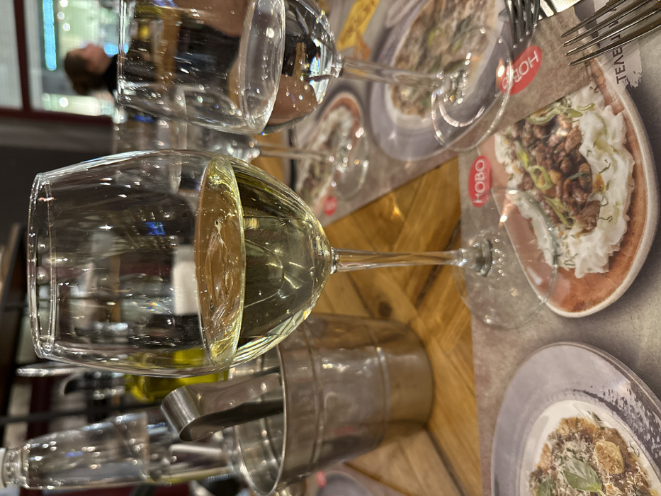 The image depicts a dining table setting inside a restaurant in Sofia, Bulgaria, likely a Happy Bar & Grill establishment. In the foreground, a clear stemmed wine glass, partially filled with a pale yellow liquid consistent with white wine, occupies the central view. To its right, a second clear stemmed glass holds clear liquid, presumed to be water. To the left of the central wine glass, a cylindrical, metallic ice bucket contains metallic tongs. Behind these items, a clear glass bottle, presumably containing water, and a smaller bottle, possibly containing olive oil, are visible. The table surface is made of light-colored wood. Beneath the glasses and plates, printed paper placemats or menus are visible. These feature photographic depictions of food items. On the left, a dish of pasta with sauce and basil is shown. On the right, a dish featuring meat on a bed of white cream or sauce with green garnish is depicted. The Bulgarian word "НОВО" (NOVO), meaning "new," is prominently displayed in red on the placemat to the right of the central wine glass, indicating a new menu item. A metallic fork is partially visible on the bottom right of the frame, resting on the placemat. In the blurred background, the indistinct outline of a person with dark hair is visible in the upper right quadrant, seated or standing within the restaurant. The overall environment suggests an indoor, casually elegant dining atmosphere with artificial lighting.