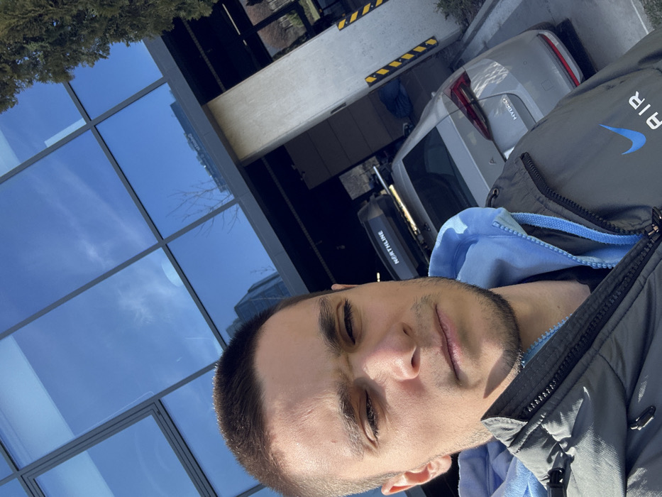 A young adult male, facing forward and appearing to take a selfie, occupies the left half of the frame. He has short brown hair, light stubble on his jaw and chin, and wears a dark gray puffer jacket with a light blue Nike Air logo on the left chest, over a light blue hooded sweatshirt. His expression is neutral. The background reveals a modern urban environment. A multi-story building with a highly reflective, dark-framed glass facade dominates the upper portion, reflecting a clear blue sky with subtle cloud formations. Below the glass facade, a gray, light-colored Skoda Octavia sedan is parked, showing "HYBRID" badging on its trunk. A black "NORTHLINE" brand roof box is mounted on the car's roof rails. To the right of the vehicle, a concrete pillar with yellow and black striped bumper guards is visible. Sparse greenery, possibly a small tree or bush, is seen on the far right. The scene is brightly lit by sunlight. The setting is a modern business or office park within the city of Sofia, Bulgaria, consistent with areas featuring contemporary glass-fronted commercial buildings and organized parking facilities. The exact street address is not definitively discernible from the visible elements.