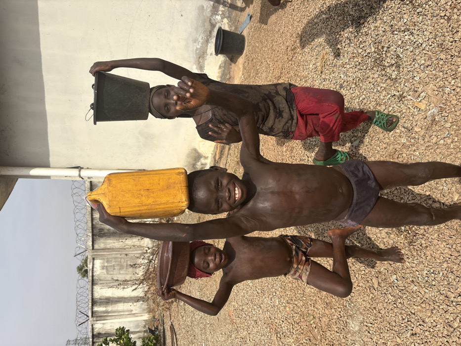 In the city of Lafia, Nigeria, three children are depicted posing outdoors on a light-colored gravel ground under bright daylight. The leftmost child, a young girl, stands barefoot with her left leg bent and foot raised. She wears patterned shorts and a reddish head covering. A brown plastic basin containing water is balanced on her head. She smiles towards the camera. The central child, a young boy, stands barefoot in dark swim trunks, with his chest and arms visibly wet. He supports a yellow plastic jerrycan on his head with both hands raised. He smiles broadly, showing teeth, and looks directly at the camera. The rightmost child, a young girl, stands with her right leg bent and foot raised. She wears a dark, patterned t-shirt and wet red pants, along with green plastic sandals. A dark plastic bucket is balanced on her head, supported by her raised left hand. Her right hand is raised with fingers extended. She looks towards the camera with a faint smile. Another dark plastic bucket is visible on the ground behind her. The background features a light-colored concrete wall topped with barbed wire on the left, and a plain light-colored building wall on the right. The sky is bright, and short, distinct shadows are cast by the children and objects, indicating a high sun angle.