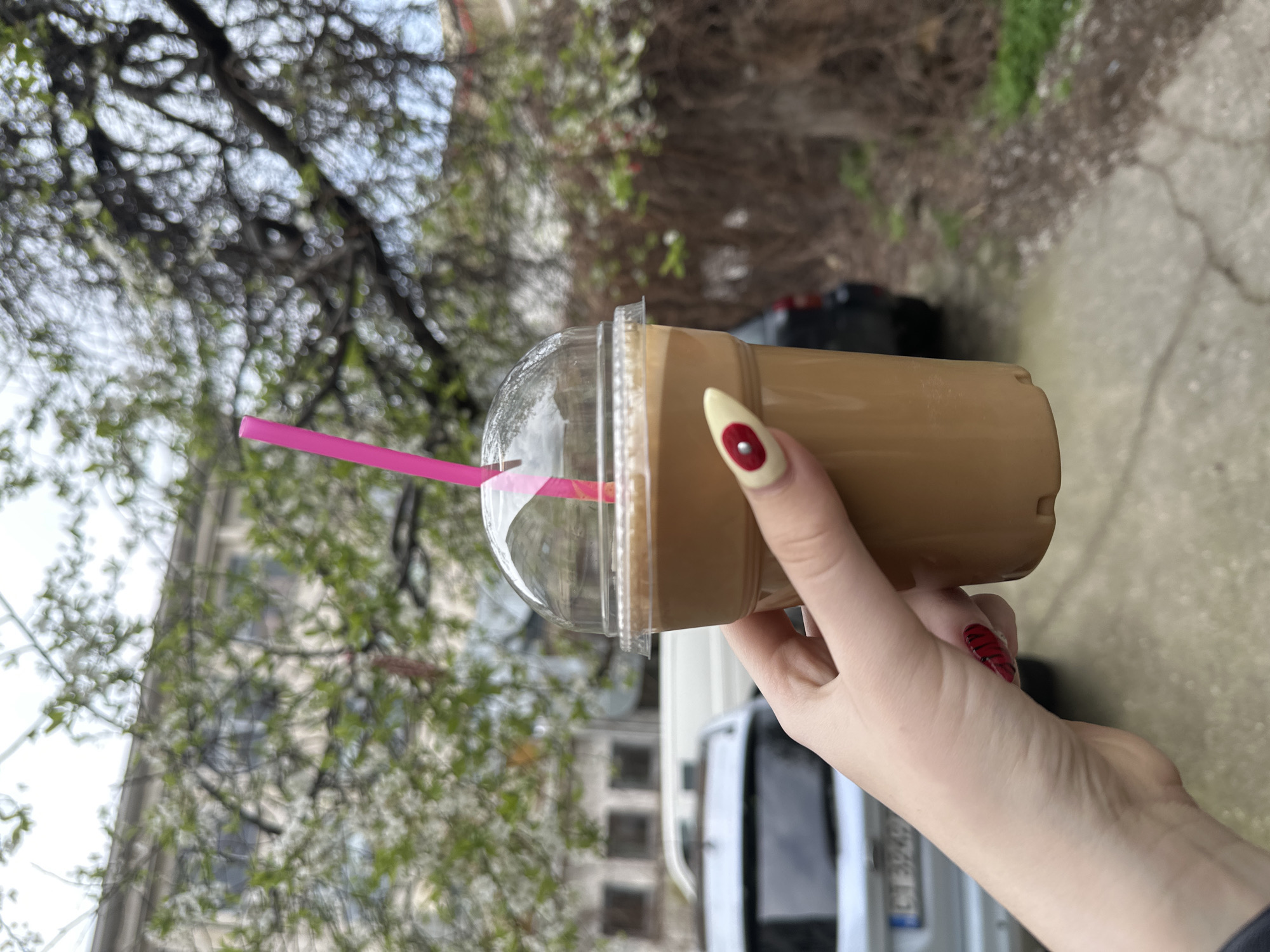A hand holds a plastic cup containing a light brown beverage with a pink straw. The cup has a clear, domed lid. The hand has painted fingernails. The background shows a blurred cityscape, including trees with budding leaves, buildings, and vehicles. The location is likely Stara Zagora, Bulgaria, as requested, though no specific landmarks are clearly visible.