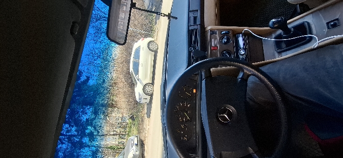 The image displays the interior of a vehicle, viewed from the driver's perspective looking forward through the windshield, depicting a scene in a residential or suburban area within Sofia, Bulgaria. The vehicle's dashboard is two-toned, with a black upper section and a tan lower section. A black, four-spoke Mercedes-Benz steering wheel occupies the center-left foreground. Behind it, an instrument cluster with analog gauges is visible, featuring an illuminated amber warning light on the lower left. The center console includes climate control knobs, a car stereo, and a manual gear shift with a black knob. A white cable extends from the stereo area down the console. A phone mount clip is attached to a dashboard vent. A rearview mirror is mounted on the windshield, from which a dark, cross-shaped ornament dangles. The driver's lap, clad in dark trousers, is partially visible in the lower frame. Outside the vehicle, an unpaved road or dirt path is visible under bright, sunny conditions. Two vehicles are parked on the left side of the path: a light-colored minivan or SUV, partially visible on the far left, and a white Kia Rio compact hatchback parked further to the right. The surrounding environment consists of bare deciduous trees and dry brush, consistent with late winter or early spring. Indistinct buildings are faintly visible through the trees in the distant background on the left. The upper section of the windshield exhibits a blue tint. The exact location within Sofia is not discernable from the provided visual information.