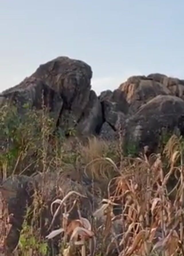A person climbs a pile of large, dark rocks. The sky is clear and light blue. Brown, dry plants are in the foreground. The person is wearing a light-colored top and dark shorts. They carefully climb up and over the rocks.