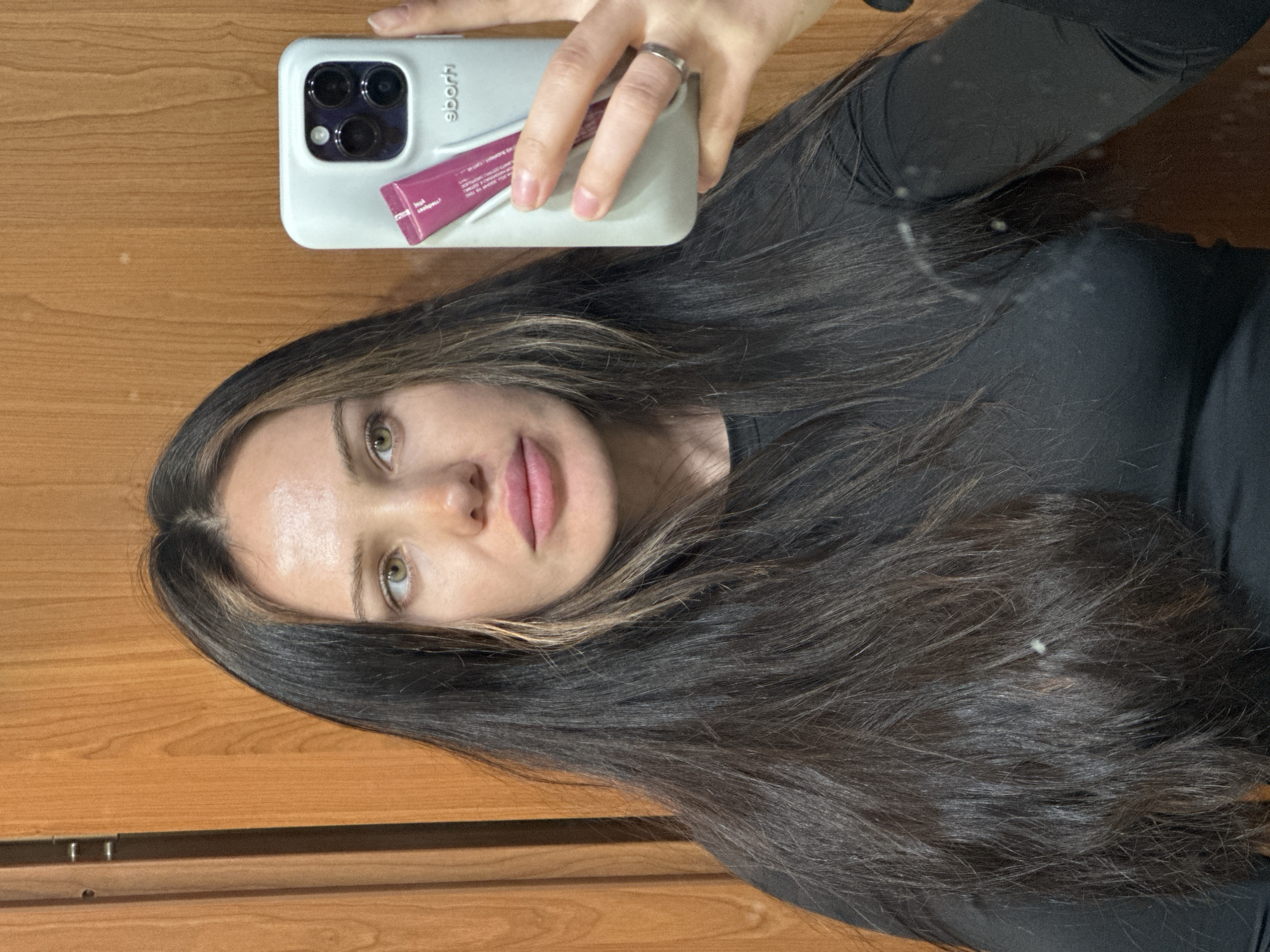 A female individual is depicted in a mirror selfie, showing her head and upper torso. She has long, dark brown hair with subtle lighter highlights, parted centrally, extending over her shoulders. Her eyes are green/hazel, and her lips are full with a pink tint. She wears a black long-sleeved garment. Her right hand, adorned with a silver-colored ring on the ring finger, holds a smartphone in a light grey silicone case. A dark pink tube is positioned between her fingers and the phone. The background consists of a vertical light brown wooden surface, consistent with a door or cabinet, featuring discernible wood grain. On the left, two metallic, cylindrical components are visible, indicative of door hardware. The scene is an indoor environment. There are no visual elements within the image to specifically identify the location as Belgrade, Serbia.