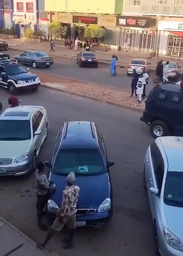 n urban street scene with parked cars, pedestrians, and several police vehicles. A dark blue armored vehicle with people on top, a black and white police pickup truck, and other unmarked cars are visible. People are standing near the vehicles, and some are walking on the sidewalk. The street is lined with buildings housing businesses such as restaurants, pharmacies, and communication services. The sky is clear, suggesting it is daytime. There appears to be a fair amount of activity and traffic in the area.