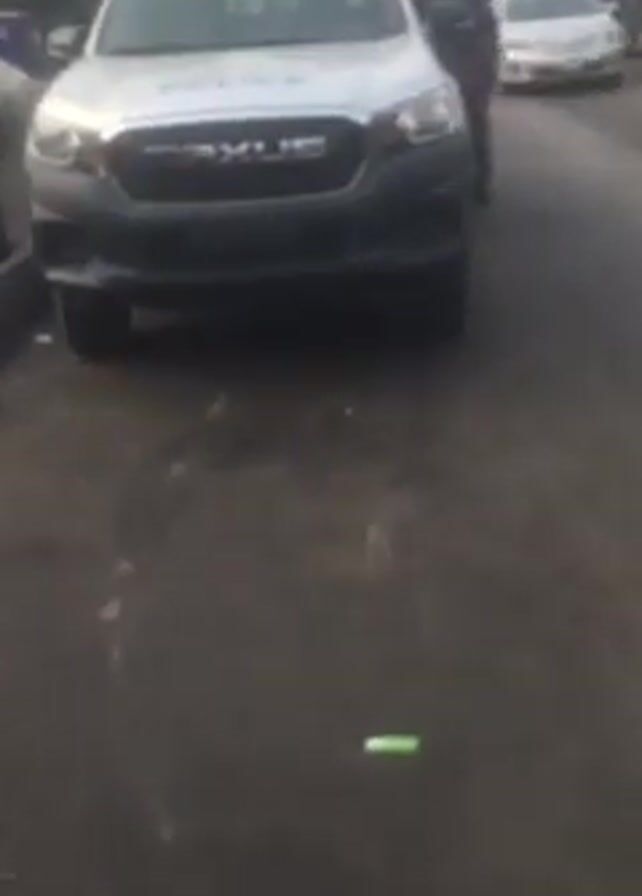A medium shot shows a white police vehicle parked on an asphalt road. The car's front is visible, displaying the word "POLICE" above the windshield. A police officer in uniform stands by the driver's side of the vehicle, with his back to the camera. Several tanker trucks are visible in the background. The sky appears overcast, suggesting a dull or cloudy day.