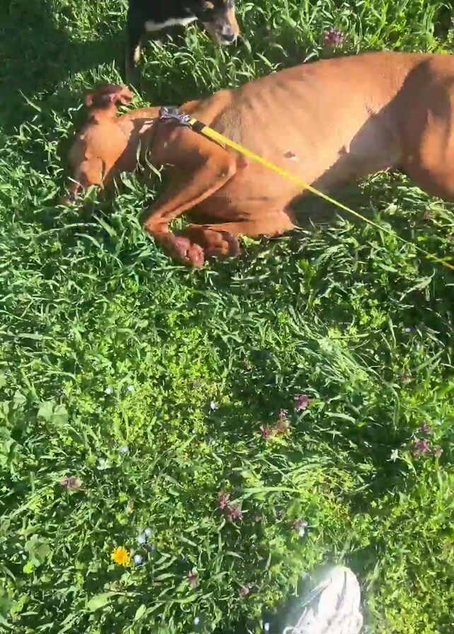 - "small black dog attacking a larger brown dog lying in green grass" by FM-h4TRP2, licensed under CC BY 4.0