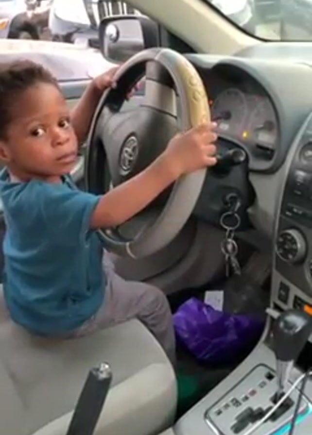 A young child is seated in the driver's seat of a car, with their hands on the steering wheel. The child is wearing a blue shirt and light-colored pants. They appear to be looking around and then reach for the ignition key. The car is parked, with the engine off. The car's interior is visible, including the dashboard, gear shift, and center console. Other cars are visible in the background outside of the car.