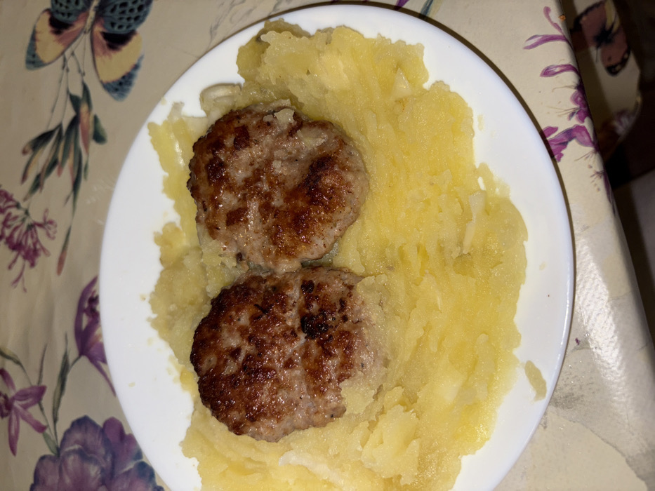 This image captures a meal served on a white, circular ceramic plate, situated on a patterned tablecloth. The scene is located in Batoshevo, Bulgaria. The plate contains two oval-shaped, pan-fried meat patties, characterized by browned, textured surfaces, positioned side-by-side near the center. These patties rest upon a substantial bed of yellow, coarsely mashed or pureed potatoes, which fills the remainder of the plate. The potatoes exhibit a lumpy consistency, with small, lighter-colored chunks visible throughout. The tablecloth features a multi-colored design incorporating purple and pink floral motifs, alongside yellow, blue, and brown butterfly patterns. No individuals or active interactions are depicted. The lighting suggests an indoor setting.