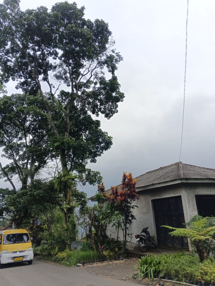 This image captures a roadside scene in Vang Vieng, Laos, under an overcast sky. A substantial tree with dark green foliage and visible branches occupies the left frame, with epiphytic ferns clinging to its trunk. A thin, dark utility line extends vertically from the top of the frame on the right side. On a paved road in the lower left quadrant, a white and yellow mini-bus with a yellow license plate is stationary, facing right. To the right of the road, a light-colored, single-story building with a multi-gabled, dark-tiled roof stands. The building features two dark, paneled garage-style doors on its front facade, with a dark motorcycle parked leaning against the wall between them. Lush vegetation, including various green shrubs and a prominent plant with vibrant red and orange leaves, is situated in front of the building and along the roadside. Several small potted plants are arranged on the ground adjacent to the road in the foreground. No individuals are visible.