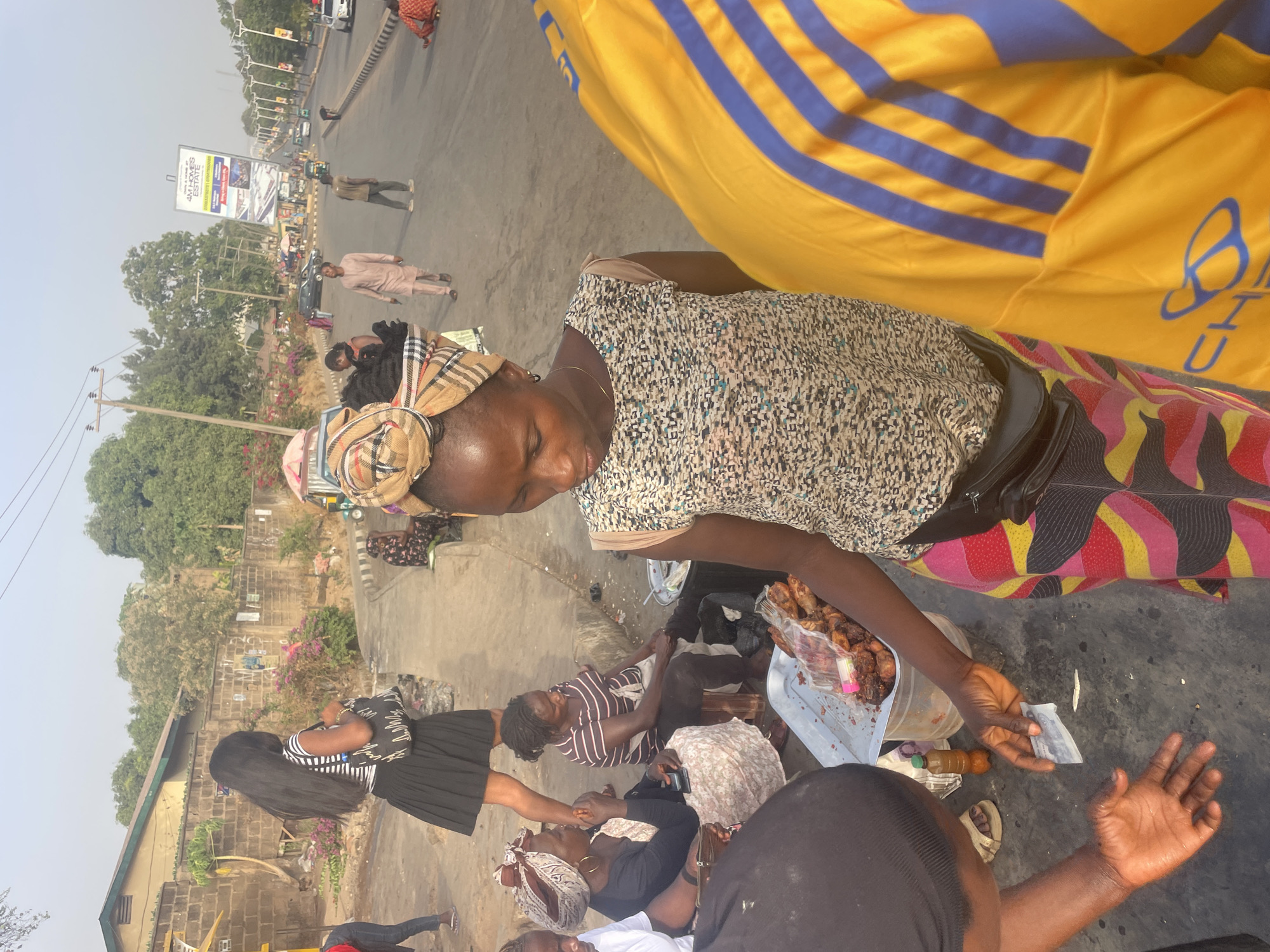 In Jos, Nigeria, a group of women are gathered on a concrete surface, likely a sidewalk or roadside. The woman in the foreground is holding money and appears to be making a transaction with someone out of frame to the right. She is wearing a patterned headwrap, a floral top, and a colorful patterned skirt. Beside her is a plastic container filled with food, possibly grilled meat or chicken. Other women are seated on the ground nearby. There is a busy road with vehicles and pedestrians in the background, along with trees, buildings, and a billboard.