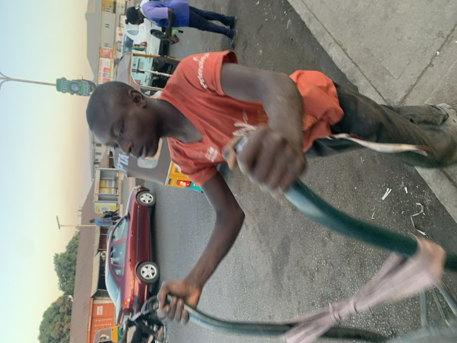 A young man in an orange shirt rides a bicycle on a street. Cars and buildings are visible in the background, suggesting an urban environment. The image is taken from a slightly low angle, emphasizing the rider's activity and focus on the road ahead. The composition and perspective capture a moment of everyday life in an African city.