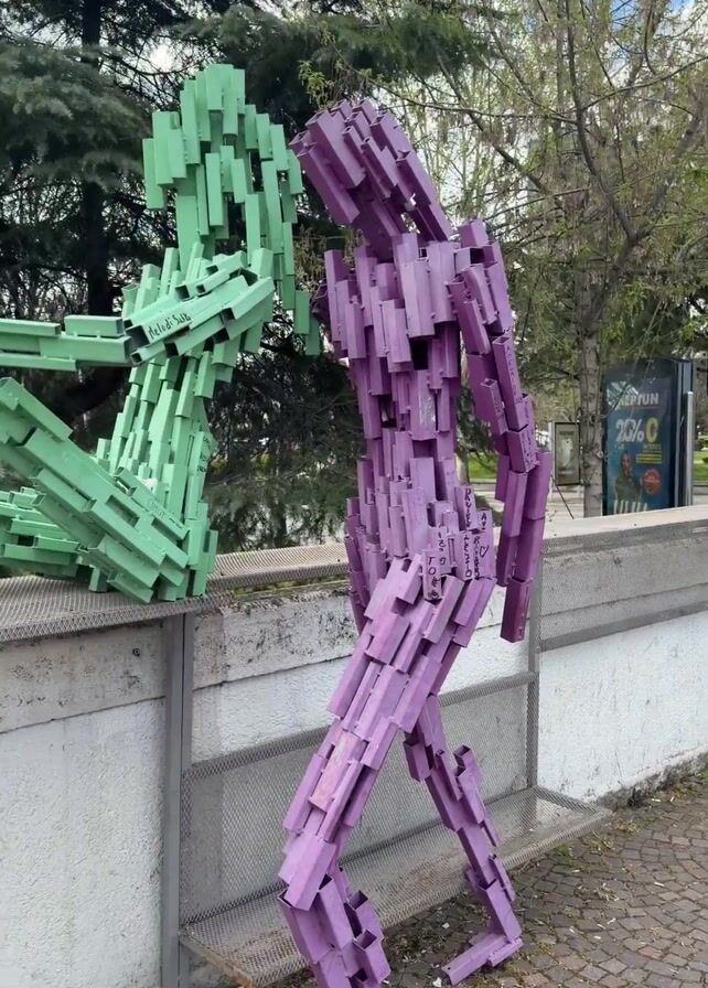 three colorful human-like sculptures made out of small rectangular blocks