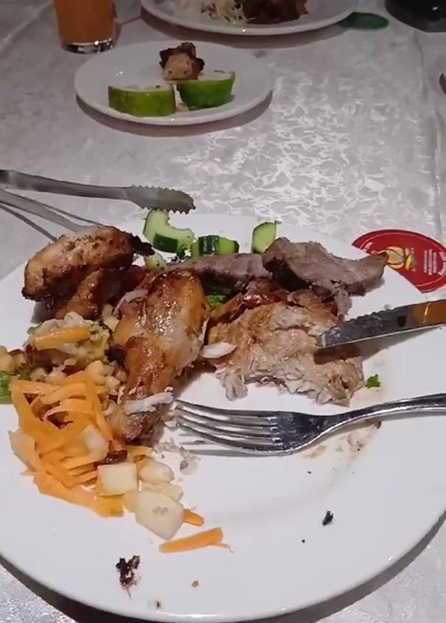 A partially eaten plate of food sits on a white tablecloth, accompanied by a glass of orange juice. The plate contains pieces of meat, shredded carrots, corn salad, and cucumber slices. A fork and knife rest on the plate. Behind the main plate are other plates of food and additional glasses of juice. The video shows the food from slightly different angles.