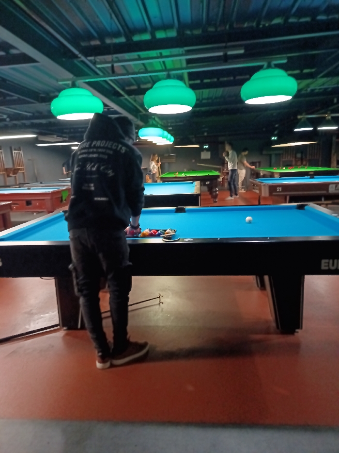 A man wearing a hooded sweatshirt and jeans is standing in front of a blue pool table in a billiard room. The table has pool balls racked and a cue ball in play. Other pool tables with players can be seen in the background. The room has a low ceiling with multiple green, saucer-shaped lights. The floor is a mix of brown and grey, with a distinctive color change between the pool table and the viewer.