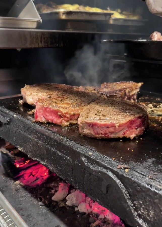 steaks being cooked in an indoor grill setup. Several thick-cut steaks are placed on a flat black stone surface, with glowing red embers visible directly beneath it. Smoke rises as the steaks sizzle. A gloved hand uses metal tongs to flip one of the steaks, transferring it to a wire rack alongside other cooked steaks. The interior of what appears to be a professional kitchen is visible in the background, including other dishes in trays. The focus remains on the steaks and the cooking process.