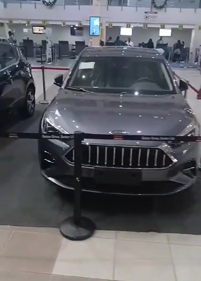 two cars on display inside a building. The first car is a gray sedan, and the second is a black SUV. Both cars are surrounded by black rope stanchions, and there is text on the ropes that reads "Better Drive, Better Life." There are people in the background walking around. The floor is tiled, and the building appears to be an airport or other transportation hub.