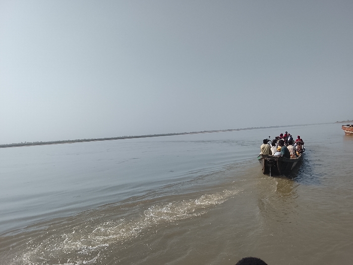 A wide, murky river in Ibi, Nigeria, under a hazy, bright sky, is depicted. In the midground, a dark wooden longboat transports approximately 10-15 individuals, moving away from the viewer and generating a visible wake. Passengers are seated, attired in light-colored clothing; some wear head coverings. A thin, flat landmass marks the distant horizon. A portion of a second wooden boat is visible on the far right. The immediate foreground water exhibits significant surface disturbance.
