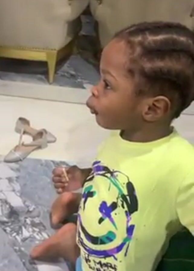 A young child stands barefoot on a marble floor, holding a small, crumbly biscuit