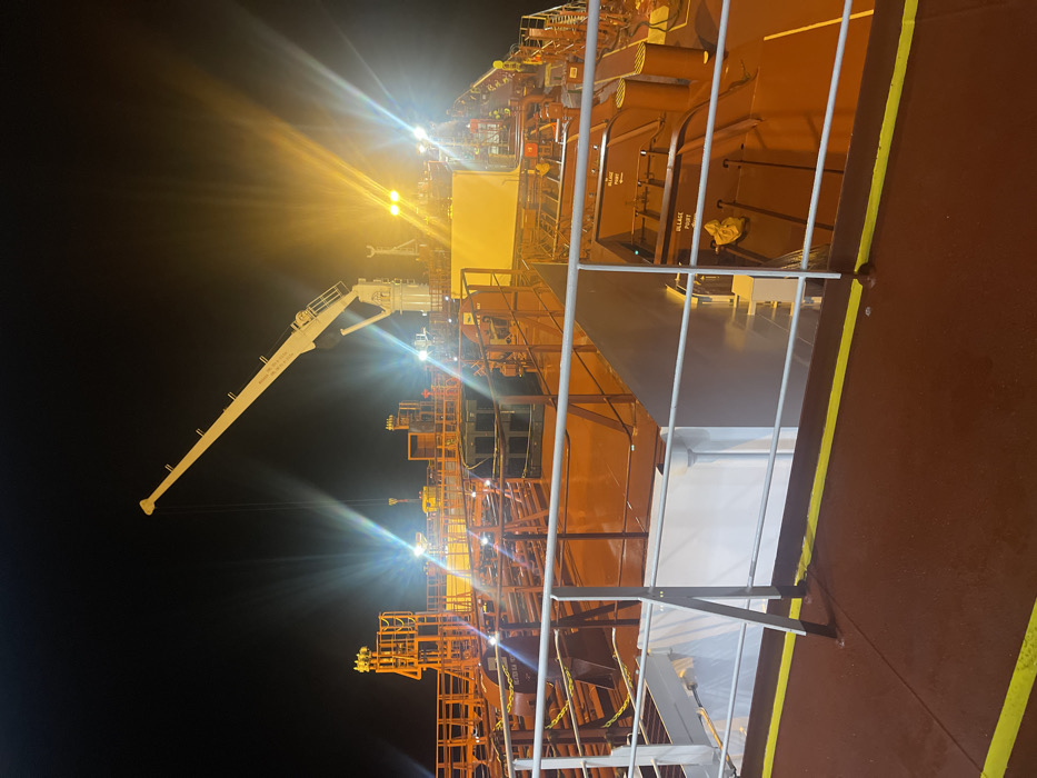 A night scene shows the deck of a large tanker ship with a reddish-brown hull