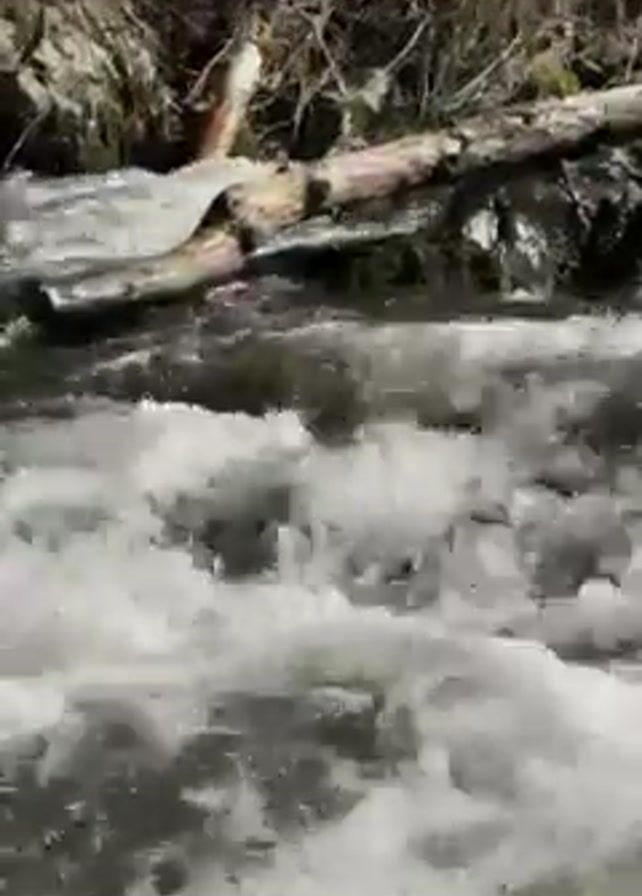 A fast-flowing stream or river is shown in the video