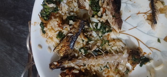 The scene depicts a partially consumed meal on a white ceramic plate in Sabon Gari West, Nigeria. The plate contains white rice mixed with fragmented green leafy vegetables and traces of a reddish-brown sauce. Central to the composition are remnants of cooked fish, specifically an identifiable fish spine with ribs and translucent tissue, alongside a distinct piece of fish with dark skin and visible flesh. Smaller pieces of fish are scattered amongst the rice and vegetables. The white ceramic plate is adorned with a recurring pattern of brown and grey leaf outlines along its lower-right quadrant. The immediate background is blurred, dark grey, and a metallic utensil handle, consistent with a spoon or fork, is partially visible in the upper background. No individuals or active interactions are present.